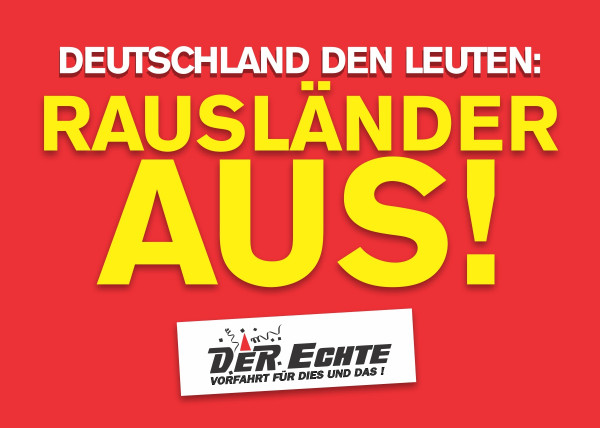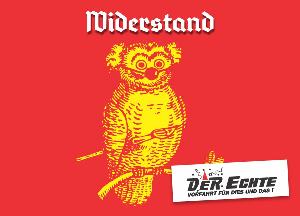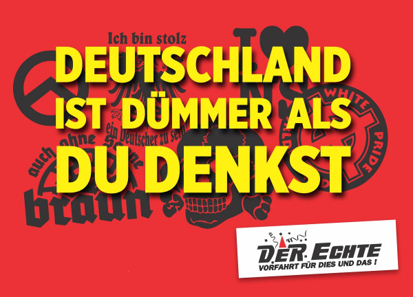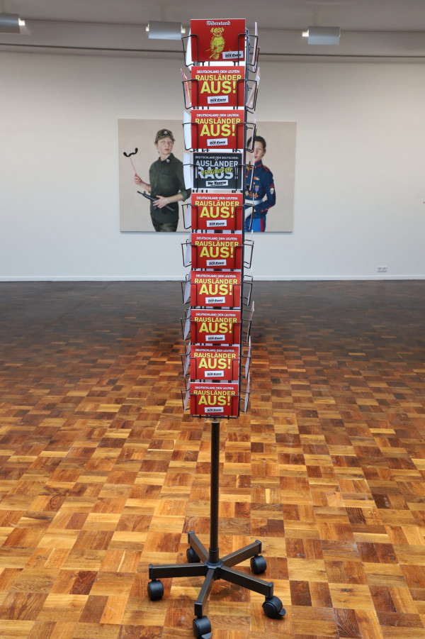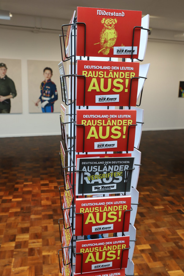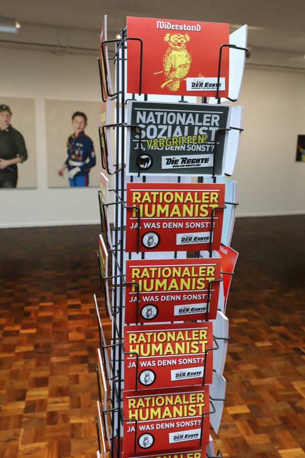 Some of the works in the exhibition “Weltgeist” referred to right-wing extremist movements of the current day. The postcard series “Der Echte” (The Real One) explicitly refers to advertising motifs of the right-wing splinter party “Die Rechte” (The Right), which is well-known in Dortmund. Four motifs of the campaigns of the party based in Dortmund-Dorstfeld are turned into their opposite through linguistic and graphic interventions, thereby advertising rationality, understanding and humanity.